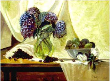 "Hydrangeas with a Bowl of Apples"
